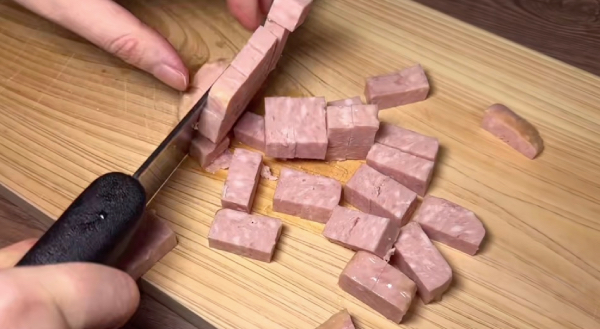 Step 1: Start off by cutting the luncheon meat into strips before proceeding to dice them up into cubes. This will make it easier for you to get luncheon meat in every spoonful of your meal later on.