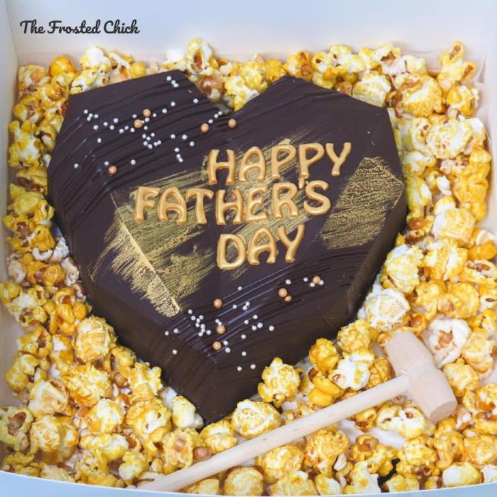 The dessert is made out of a rich dark chocolate shell that has a simple Father’s Day greeting worded in gold and comes in a cake box filled with yummy popcorn filler. Get your dad to crack open the cake to reveal a hidden chocolate surprise inside with the provided wooden mallet!