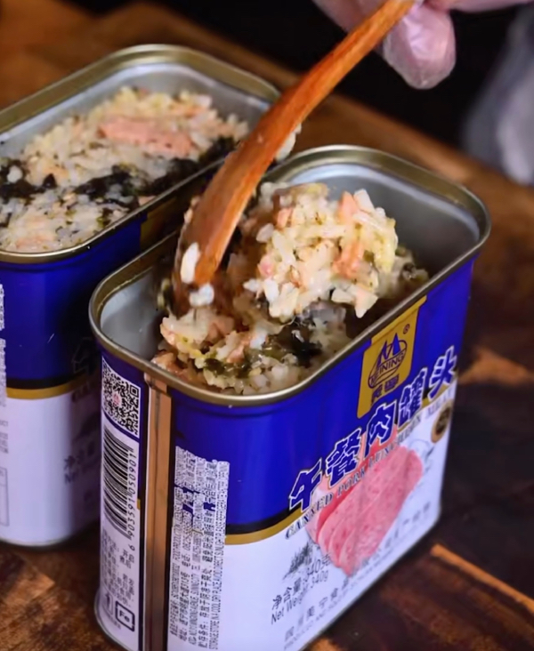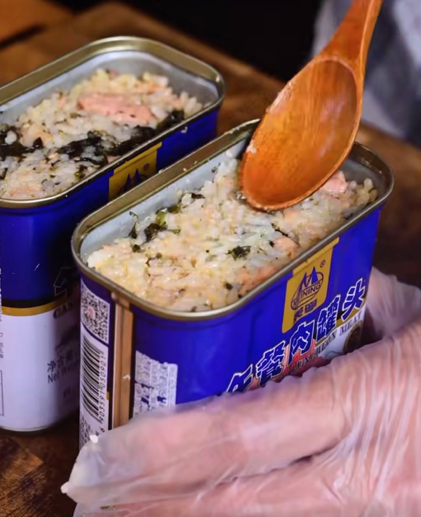 Step 6: Scoop the mixture into the empty cans or aluminium tins you set aside earlier. Be sure to leave a bit of space at the top after you’ve smoothened the rice out.