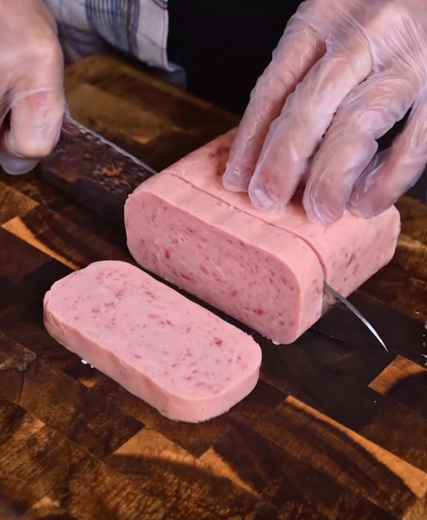 Step 2: Cut two thick slices of luncheon meat as seen in the photo below. The two slices will be what you’re going to use, so you can keep the rest in the fridge.