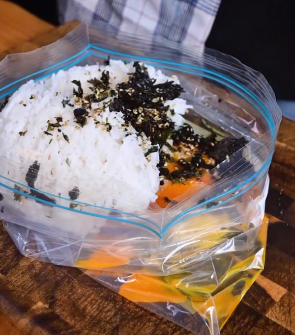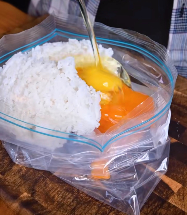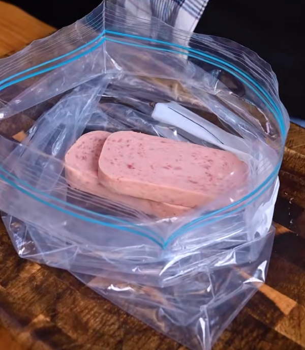 Step 3: Place the two slices of luncheon meat and two bowls of rice in a huge ziploc bag.