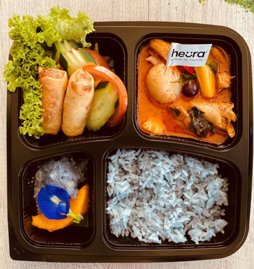 This vegan curry comes in a bento box together with Blue Jasmine rice, crispy vegetarian spring rolls and mini mango sticky rice.