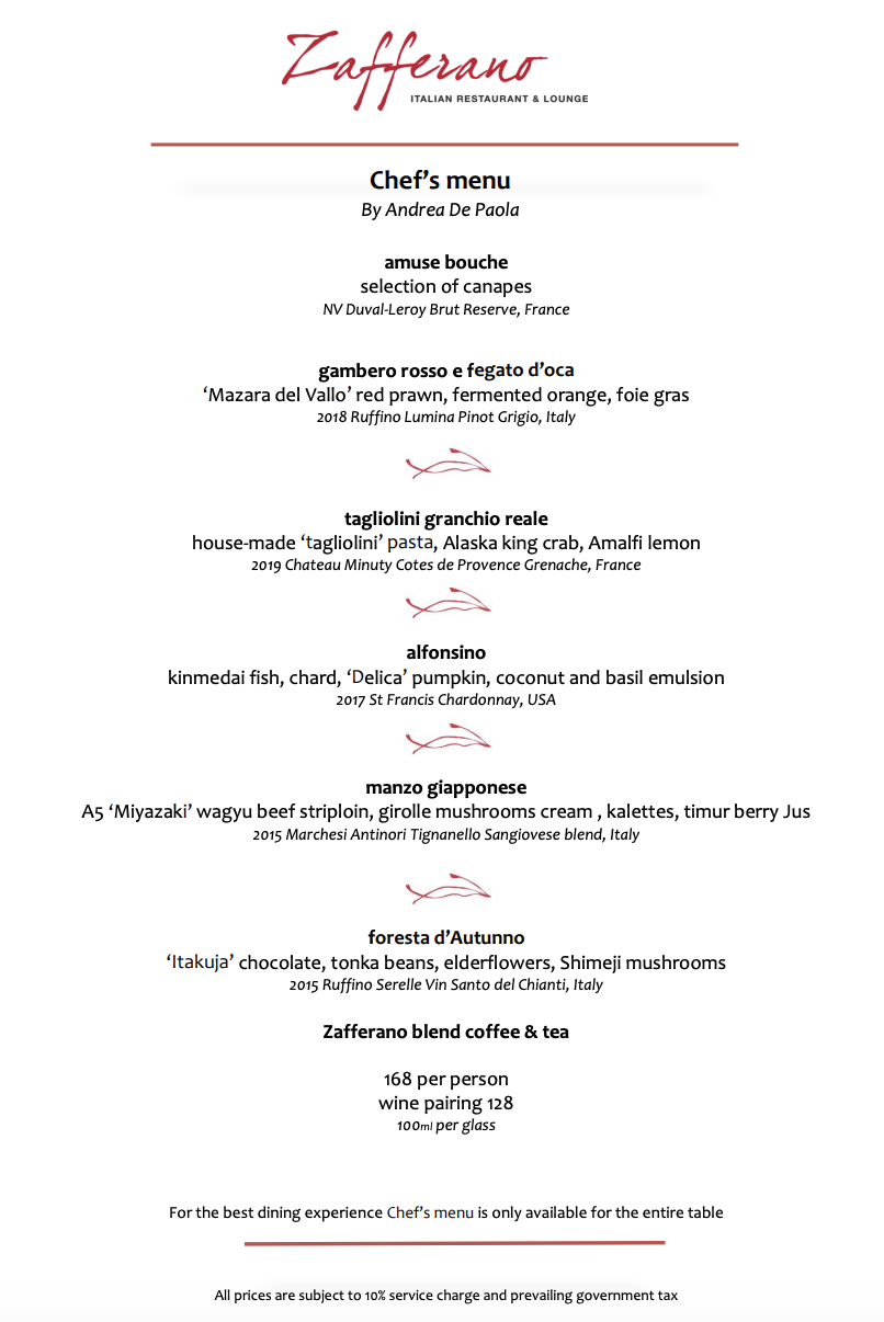 The five-course Chef’s Menu is available for lunch and dinner at S$168++ per person, inclusive of amuse bouche (selection of canapes), petit fours, and coffee or tea. You may also complement your meal with a wine pairing of six glasses (100ml per glass) at S$128++ per person.