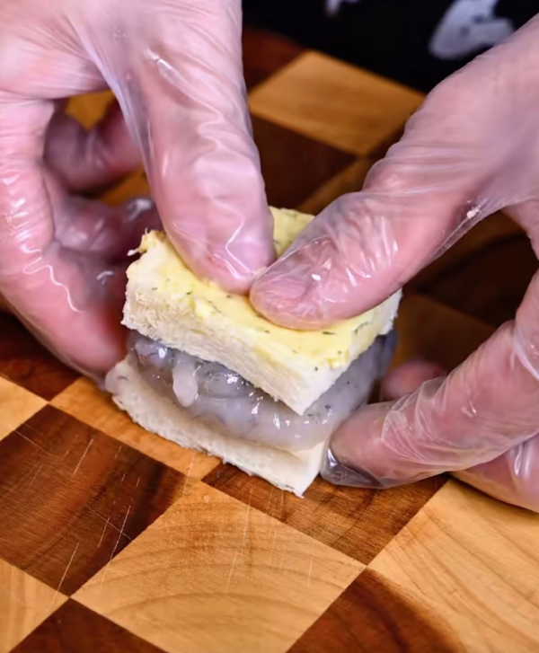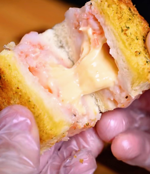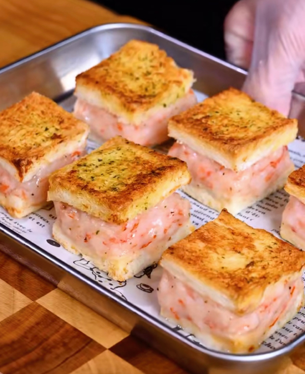 The top of the bread slice is brushed with an aromatic garlic spread, and these bite-sized shrimp sandwiches also have a surprise within them.