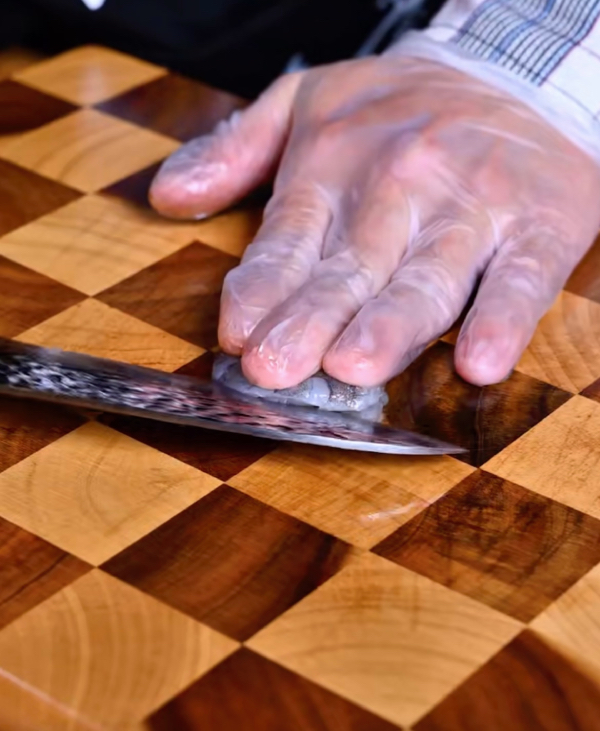 Step 1: Remove the intestinal tract of the shrimps by making a shallow cut along the length of the black line and carefully lifting it up with the tip of your knife.