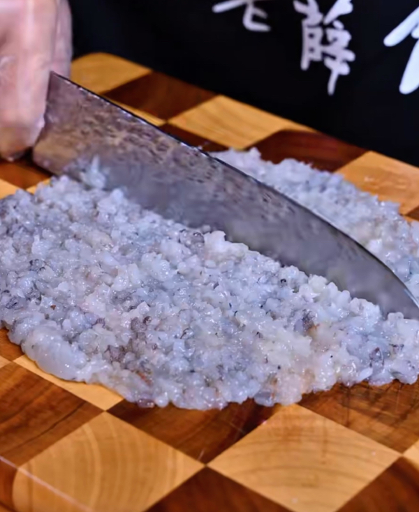 Step 2: Chop up all of the shrimps until they are minced and transfer them to a mixing bowl.