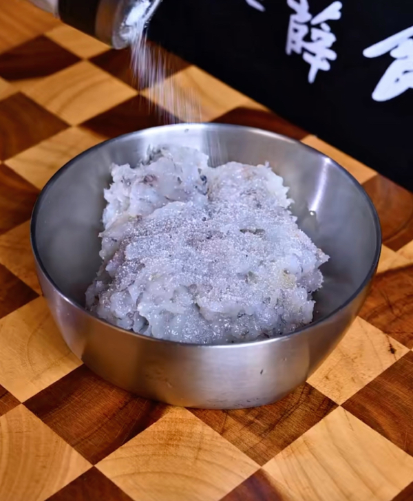 Step 3: Add a pinch of salt and pepper to the minced shrimps. Mix evenly before putting the bowl aside.