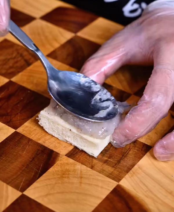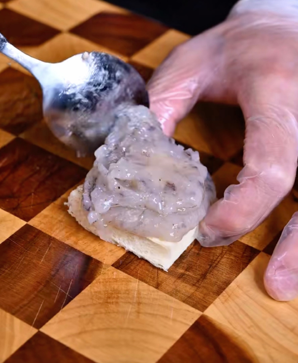 Step 8: Grab the cheese squares and press them right into the middle of the minced shrimps. Make sure it’s tightly enveloped by the minced shrimps because it will be your cheese core, and you wouldn’t want the cheese to ooze out before your guests take a bite!