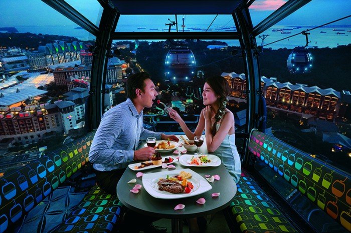 Dine within your own private “room” on a cable car, feasting on a four-course dinner. Book it at the right time and you’ll get to enjoy the sunset followed fabulous night view of Mount Faber Park, Universal Studios, and Resorts World Sentosa.