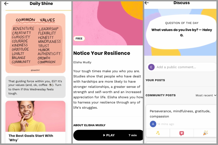 Shine is a self-care app that focuses on personal growth, motivational messaging, and self-improvement delivered in both text and audio.