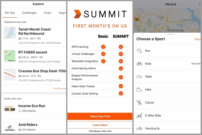 Strava is available on iOS and Android. | Free or Summit subscription at SGD 78.98/year with one month free trial.
