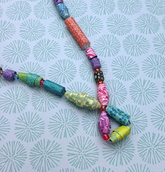 The process is as simple as rolling up strips of scrapbooking paper, glueing down the tail and stringing them together, and voila, a super cute necklace or bracelet your kid can wear as accessory!