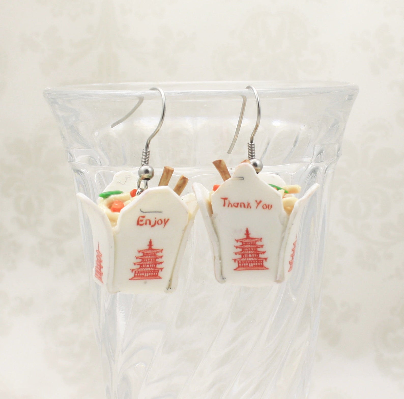 Chinese takeaway boxes do not have to only appear in your favourite American Rom-coms! Paired with a basic t-shirt and denim, these Chinese takeaway box earrings will easily add a fun twist.