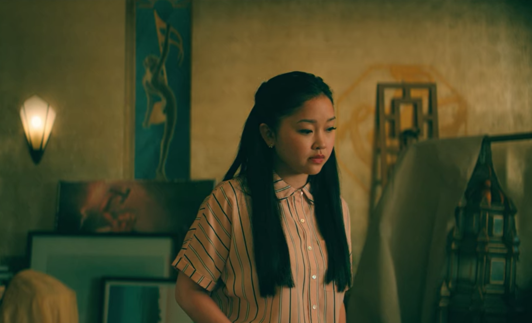 Lara Jean’s school outfits are always #goal. Here she is sporting her signature high-neck top with a mini skirt and, of course, a headband of a contrasting colour to finish the outfit.