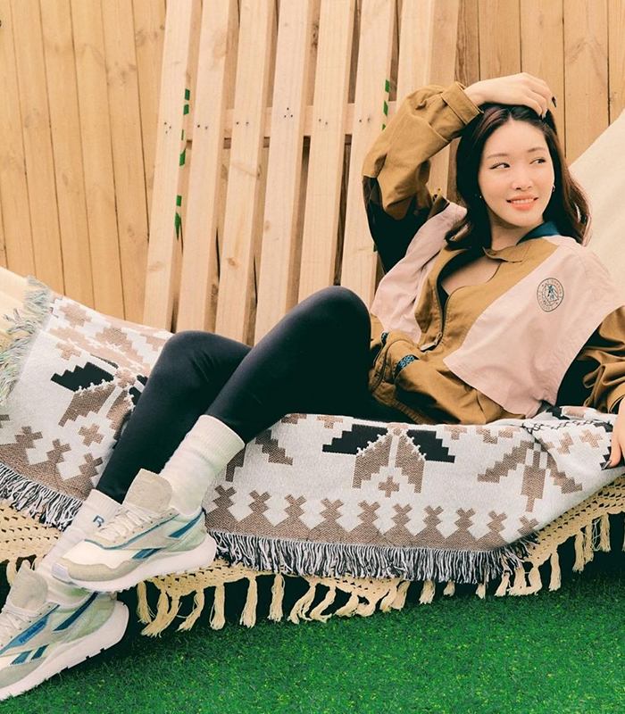 Singer Chungha is often known for her sweet disposition. In this photo, she shows off her gorgeous smile, and sports the Reebok Classic Leather Legacy AZ Shoes in Chalk/Seaport Teal/Alabaster. Paired with white socks, black leggings and a brown-beige top, Chungha looks chic and cool all at the same time. These sneakers are also more environmentally friendly as they are made with at least 30% recycled materials.
